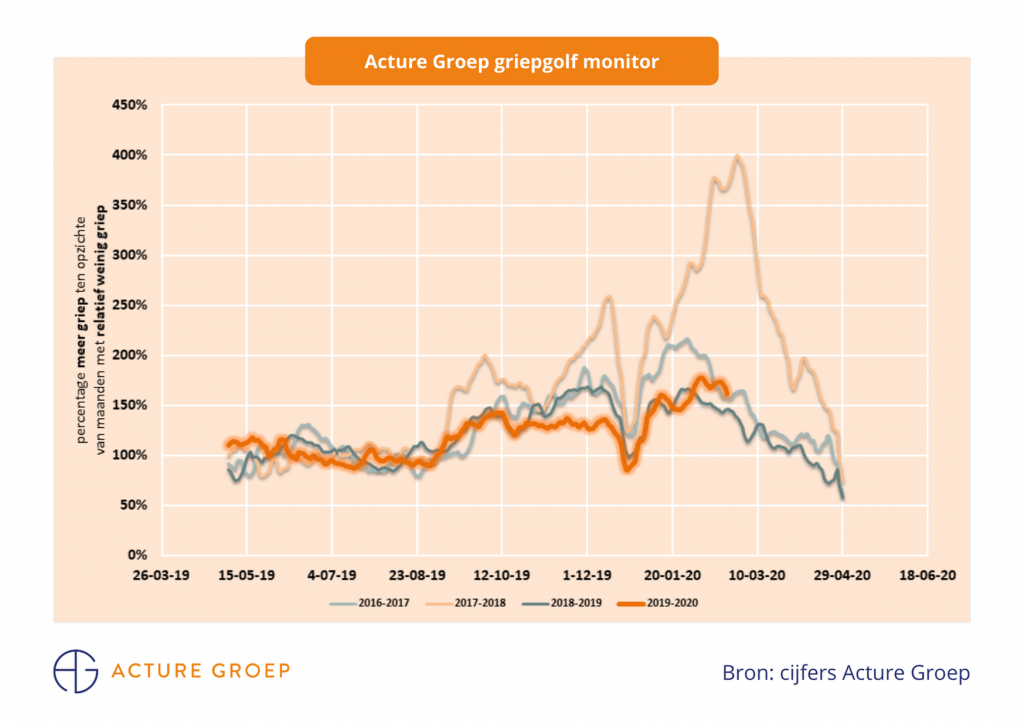 Uit de Acture Griepgolf Monitor blijkt dat het aantal griepgevallen stijgt. In de periode van oktober vorig jaar tot en met januari 2020 zijn er minder griepgevallen dan in dezelfde periodevoorgaande jaren. De griepperiode van dit jaar leek milder te zijn dan de griepperiode vorig jaar (2018-2019). Vanaf februari 2020 zien we echter dat het aantal griepgevallen hoger ligt dan vorig jaar.